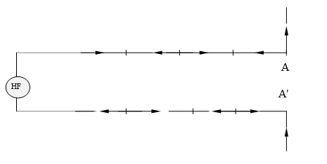 Pour la tension u, nous trouverons un maximum pour chaque point i = 0, et inversement. Les courants, puisque de sens opposés, créent des champs électriques (et magnétiques) de sens alternés qui s’annulent deux par deux : la ligne ne rayonne pas de l’énergie. Par contre, si la ligne est repliée en A et A’, de façon à aligner les brins AB et A’B’, ces deux brins sont parcourus par des courants de même sens et rayonnent.